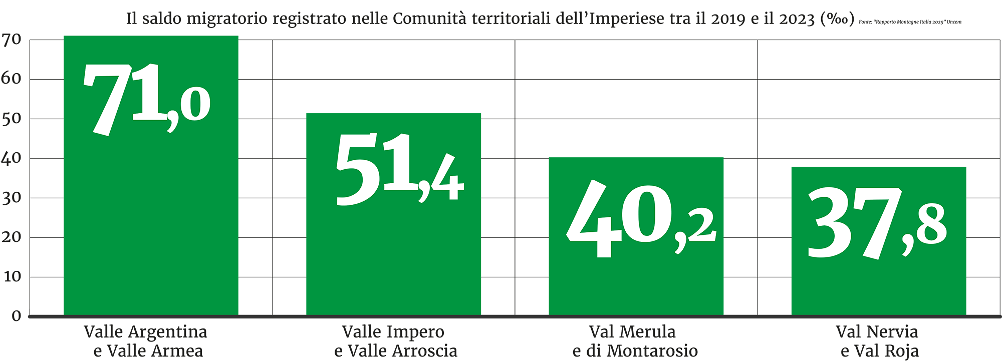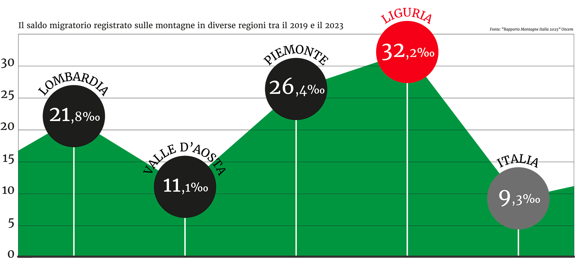 P iù 32,2 per mille. È il saldo migratorio registrato sulle montagne liguri tra il 2019 e il 2023 a mettere in luce un ritorno alle aree interne da parte della popolazione, non solo straniera, ma anche da parte dei cittadini italiani. Il dato, contenuto nel Rapporto Montagne Italia 2025 dell’Uncem, è di gran lunga superiore alla media registrata a livello nazionale, ferma comunque ad un positivo +9,3 per mille, e testimonia un trend che i promotori dello studio hanno chiamato la “Stagione del Risveglio” delle nostre montagne.